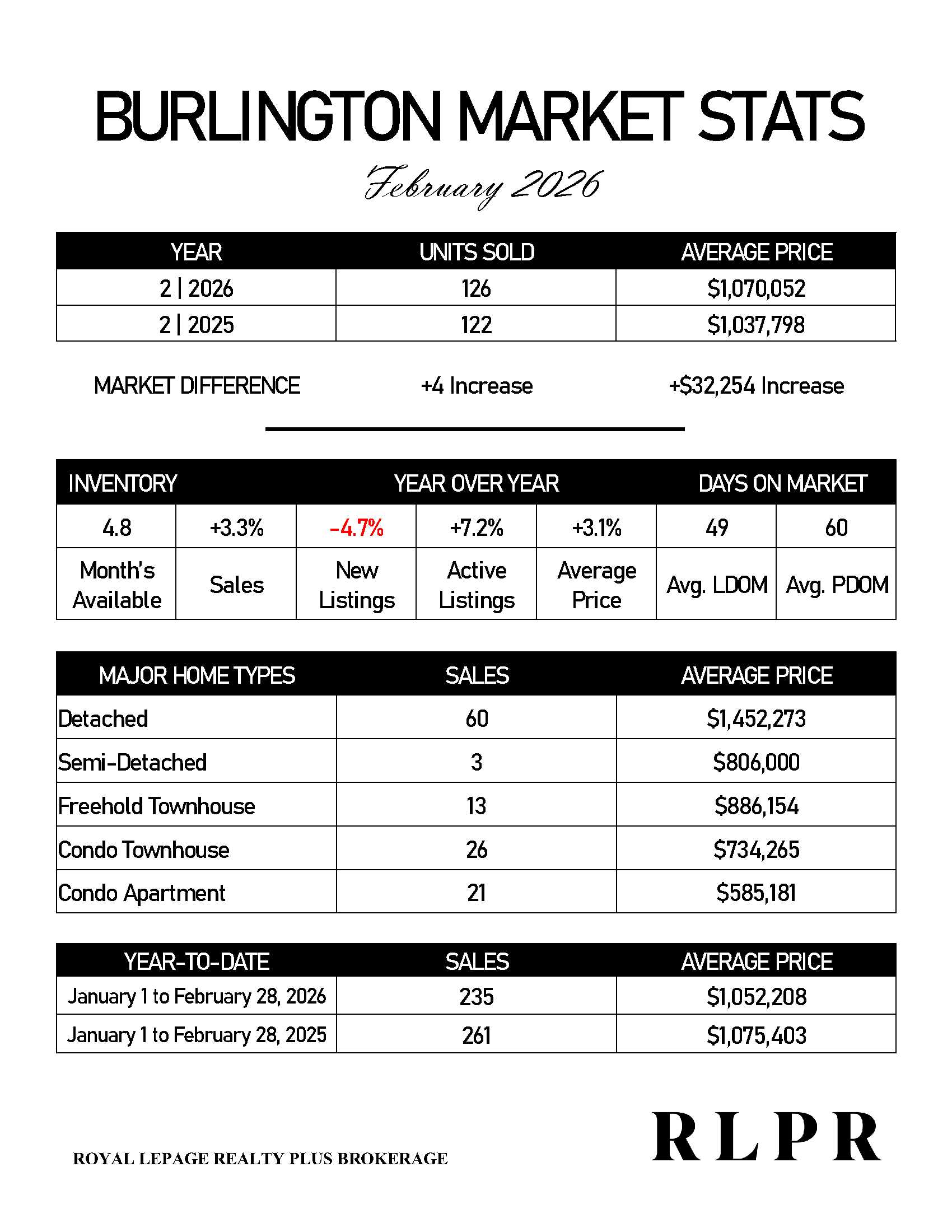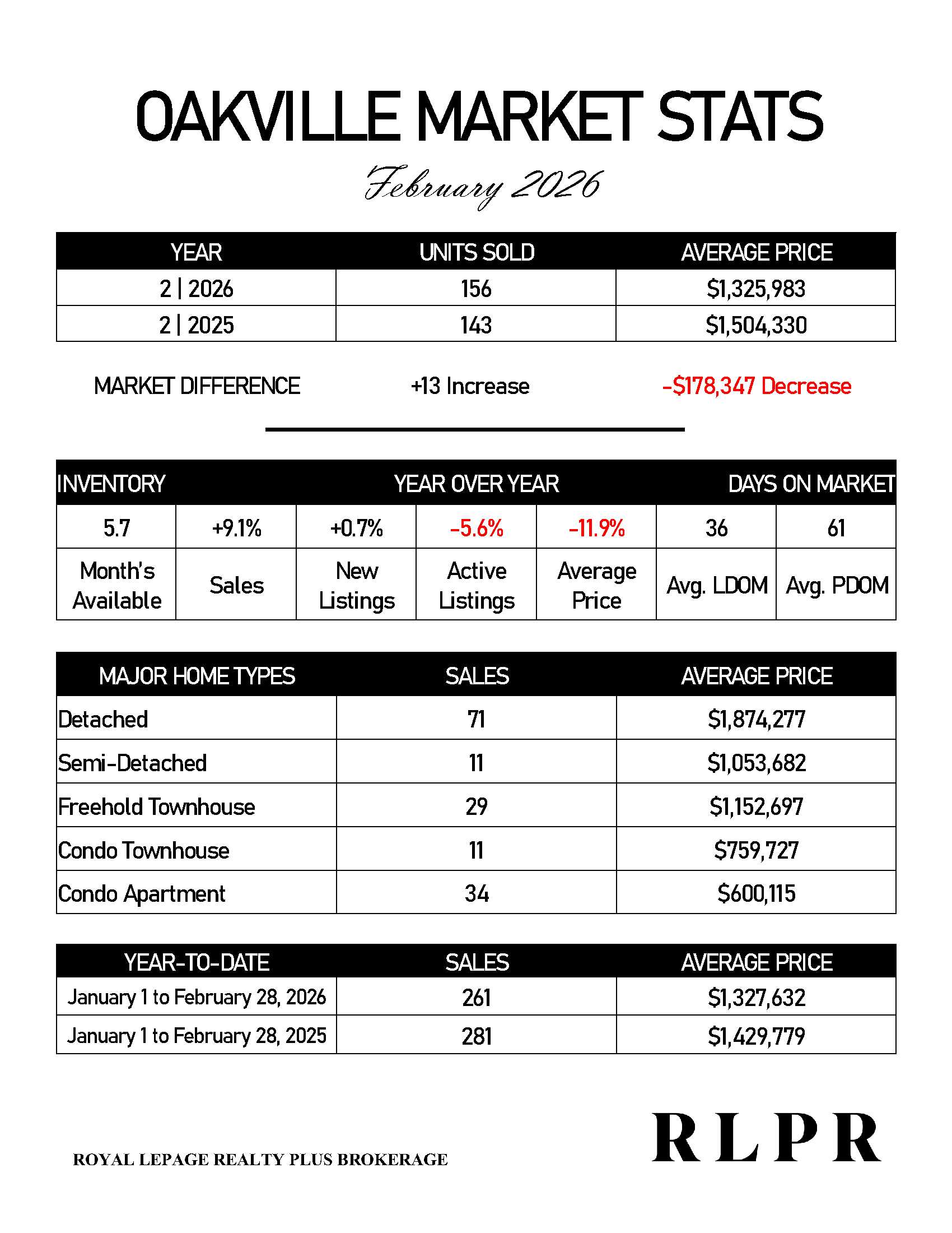 Oakville-Burlington Real Estate Update - February 2026 Wednesday Mar 11th, 2026 Share Tags: Oakville-Burlington Real Estate Update - Oakville Home Prices - Burlington Home Prices - Royal LePage - Royal LePage Realty Plus