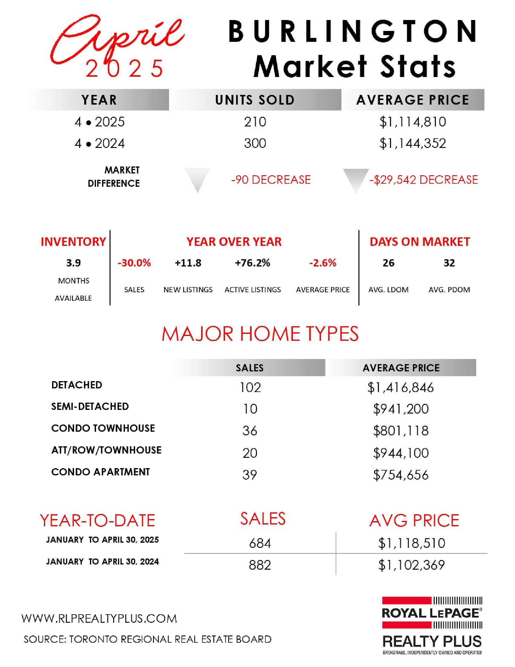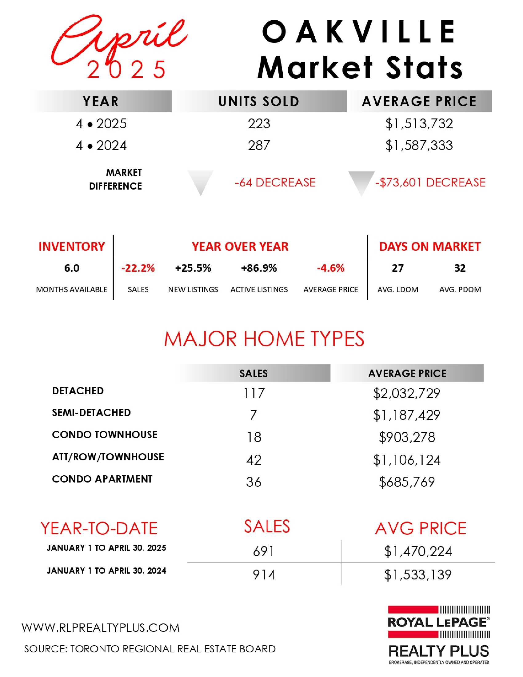 Oakville-Burlington Real Estate Update - April 2025 Friday May 09th, 2025 Share Tags: Oakville-Burlington Real Estate Stats - Oakville-Burlington Real Estate Update - Oakville Home Prices - Oakville-Burlington Housing Prices - Royal LePage Realty Plus Oakville - Burlington Home Prices - Your Neighbourhood Realtor®