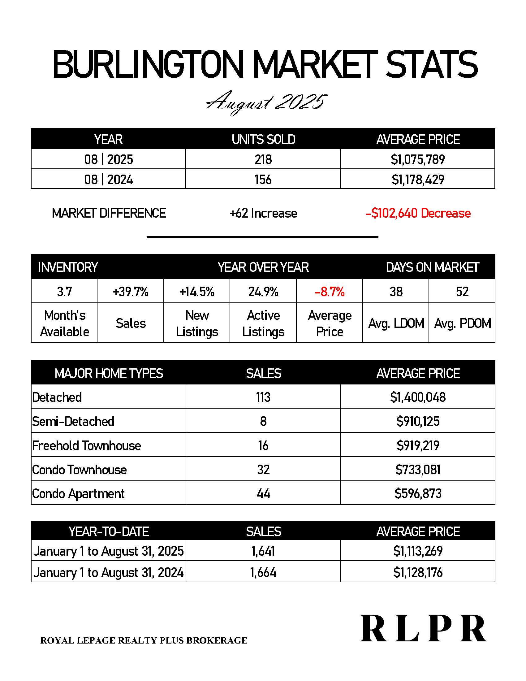 Oakville-Burlington Real Estate Update - August 2025 Wednesday Sep 10th, 2025 Share Tags: Oakville-Burlington Market Stats - Oakville Home Prices - Burlington Home Prices - Oakville-Burlington Home Prices - Royal LePage - Royal LePage Realty Plus Oakville - Your Neighbourhood Realtor