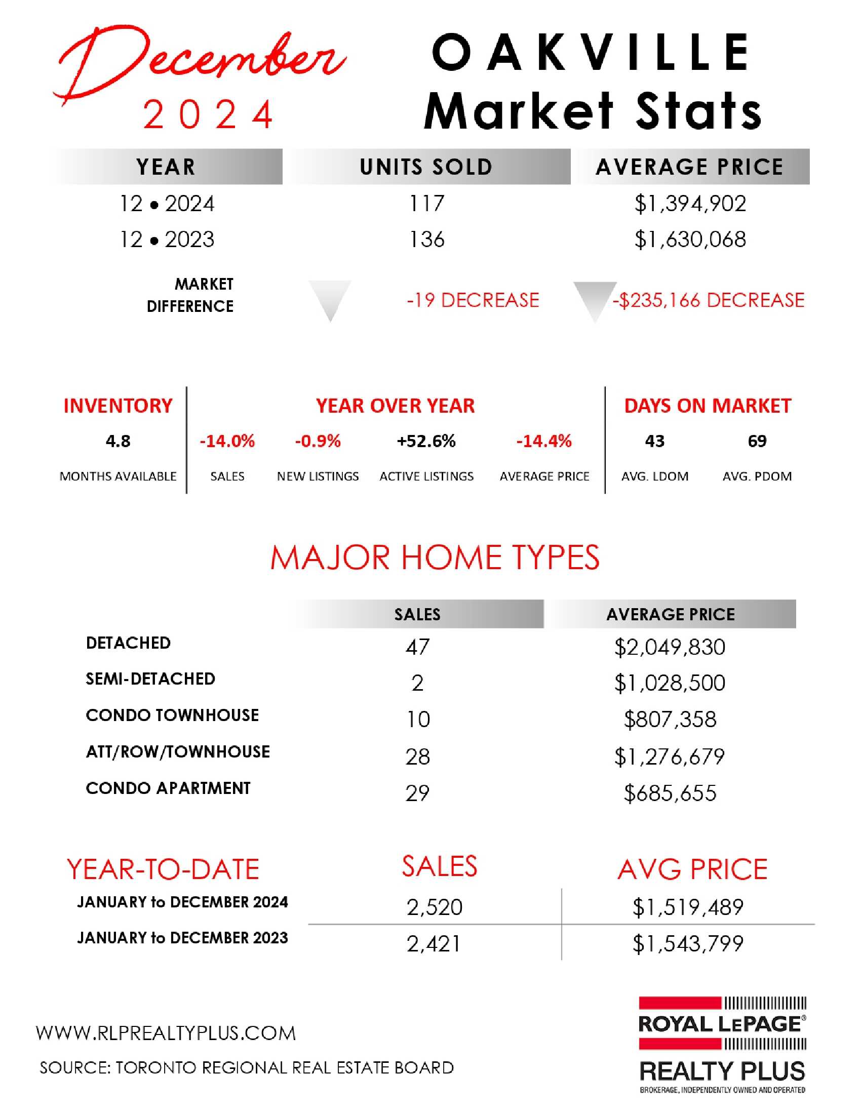 Oakville-Burlington...December 2024 residential re-sale housing sales summary as reported by the Toronto Regional Real Estate Board (TRREB)…
