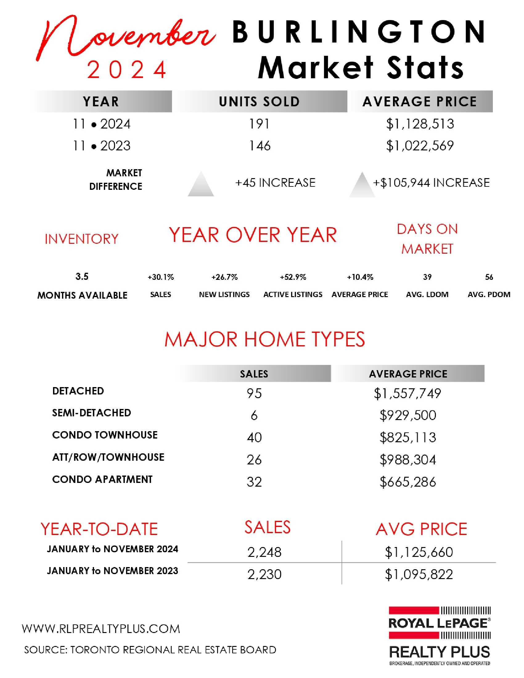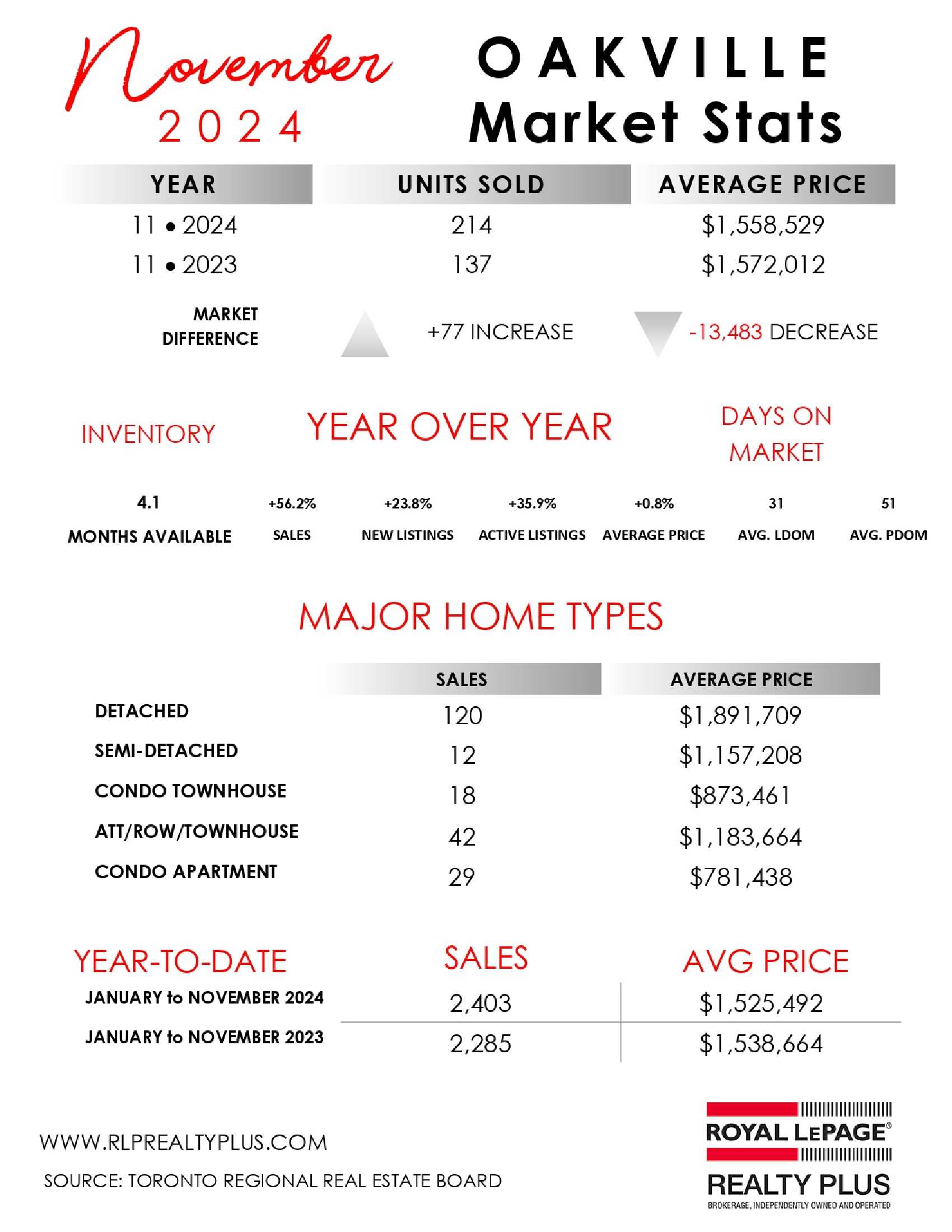 Oakville-Burlington...November 2024 residential re-sale housing sales summary as reported by the Toronto Regional Real Estate Board (TRREB)…