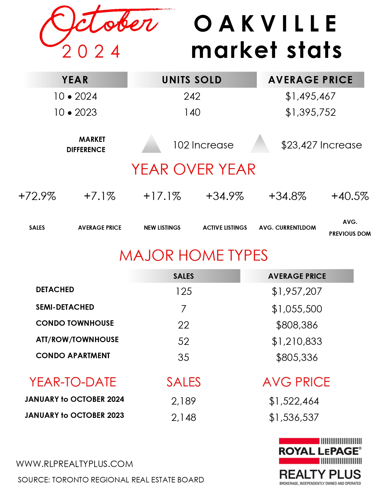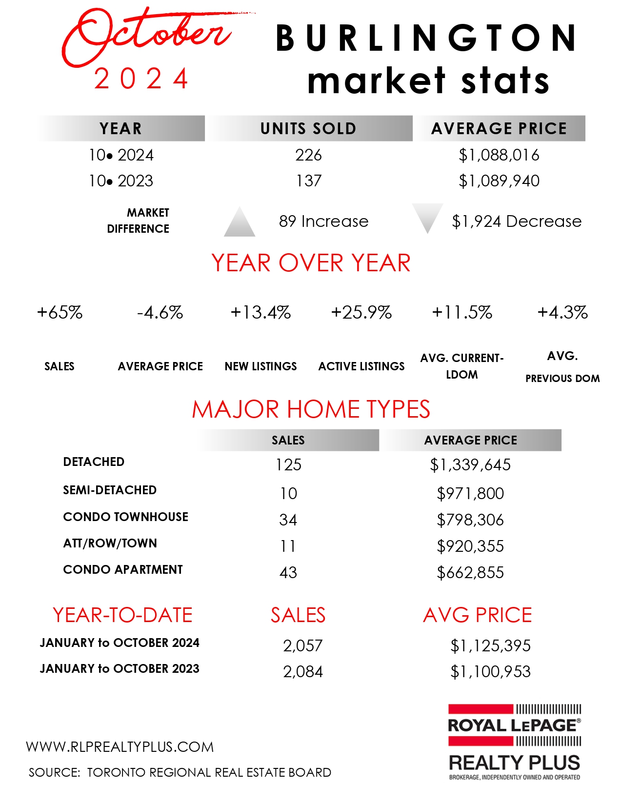Oakville-Burlington...October 2024 residential re-sale housing sales summary as reported by the Toronto Regional Real Estate Board (TRREB)…