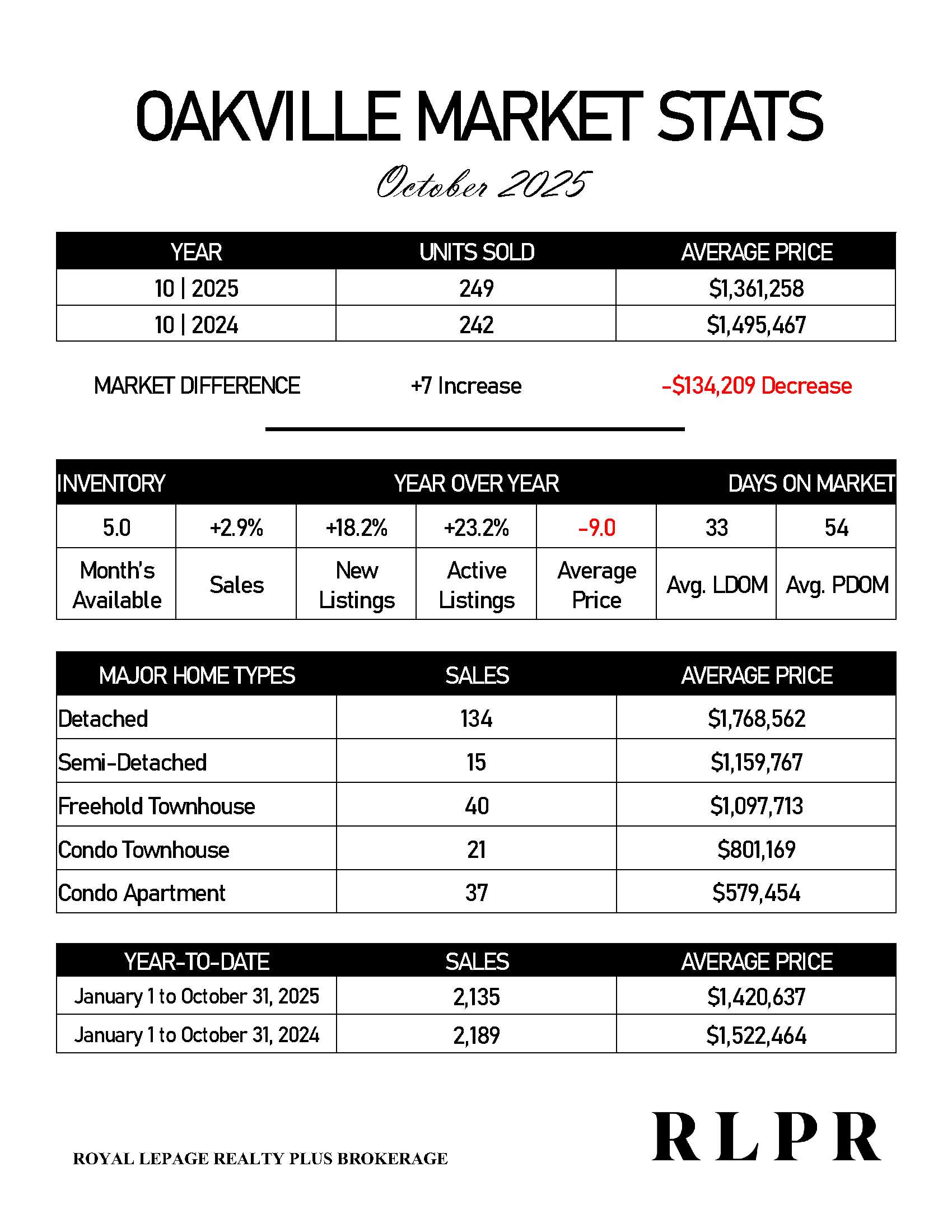 Oakville-Burlington Real Estate Update - October 2025 Thursday Nov 13th, 2025 Share Tags: Oakville Home Stats - Burlington Home Stats - Oakville-Burlington Home Sales - Oakville Real Estate - Burlington Real Estate - Royal LePage - Oakville Real Estate Update - Burlington Real Estate Update - Oakville Home Prices October 2025 - Burlington Home Prices October 2025