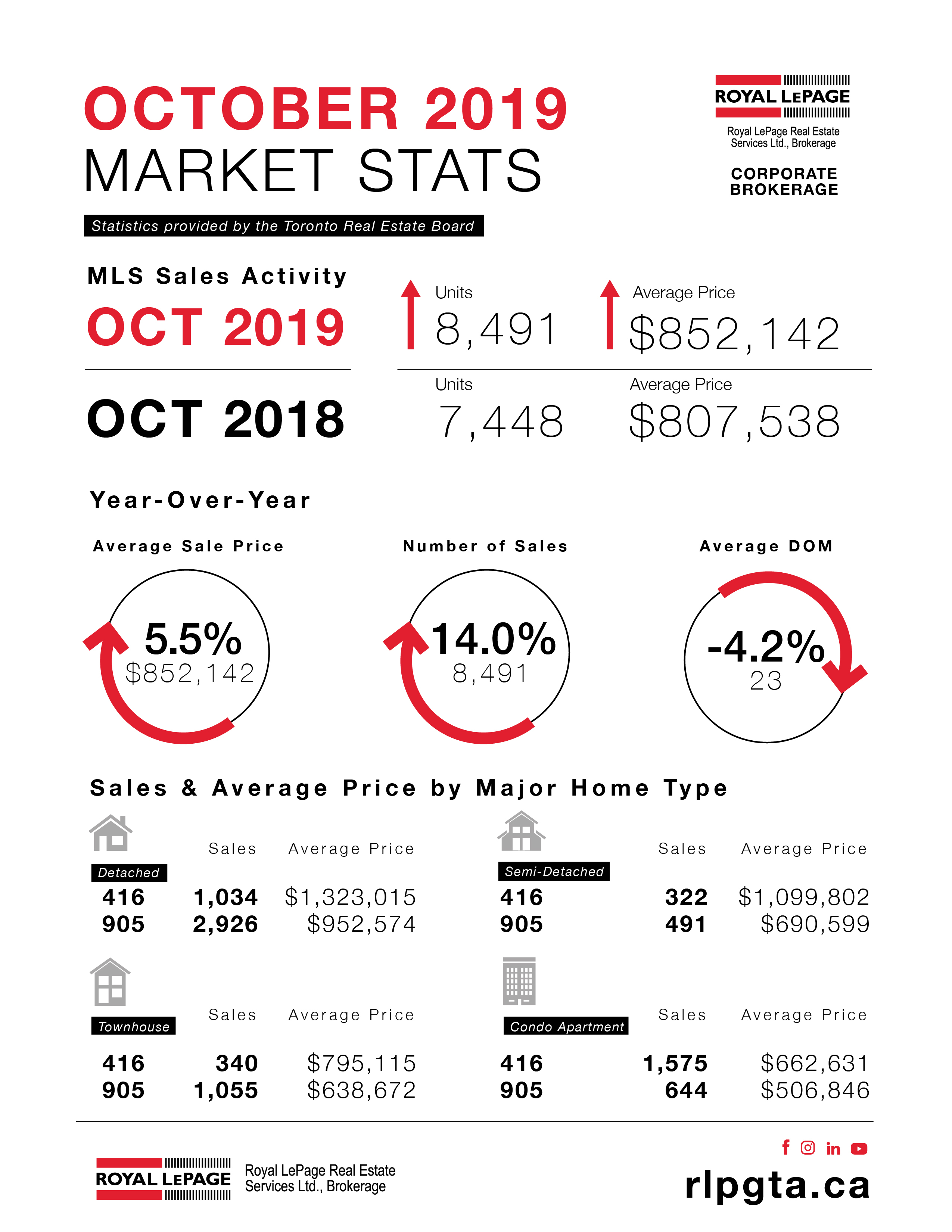 8,491 home sales were reported through the Toronto Real Estate Board MLS in October 2019, continuing the trend of improved year over year sales with a 14 per cent jump from the same month a year earlier. Conversely, the number of properties for sale continued to trend downward with a 9.6 per cent decline in new listings and an 18.8 per cent decline in active listings compared to October 2018. More sales with less inventory resulted in a 5.5 per cent growth in prices averaged across all property types. With the risk of rising interest rates muted, the supply crunch in the GTA continues to impact affordability as the key driver of rising price growth.